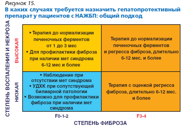 В связи с широкой распространённостью неалкогольной жировой болезни печени данное заболевание с каждым годом становится не только наиболее частой причиной циррозов печени, но и гепатоцеллюлярной карциномы. На рисунке 15 из данного пособия предоставлены цели терапии у пациентов с НАЖБП в зависимости от выраженности воспаления и фиброза в печени.