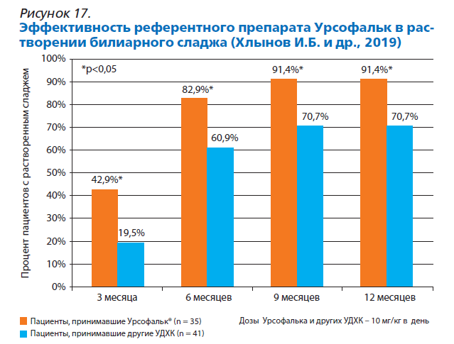 Высокая эффективность Урсофалька продемонстрирована в целом ряде клинических исследований, которые описаны в пособие. На рисунке 17 из данного пособия в качестве примера показана более высокая эффективность Урсофалька по сравнению с другими препаратами урсодезоксихолевой кислоты в растворении билиарного сладжа.